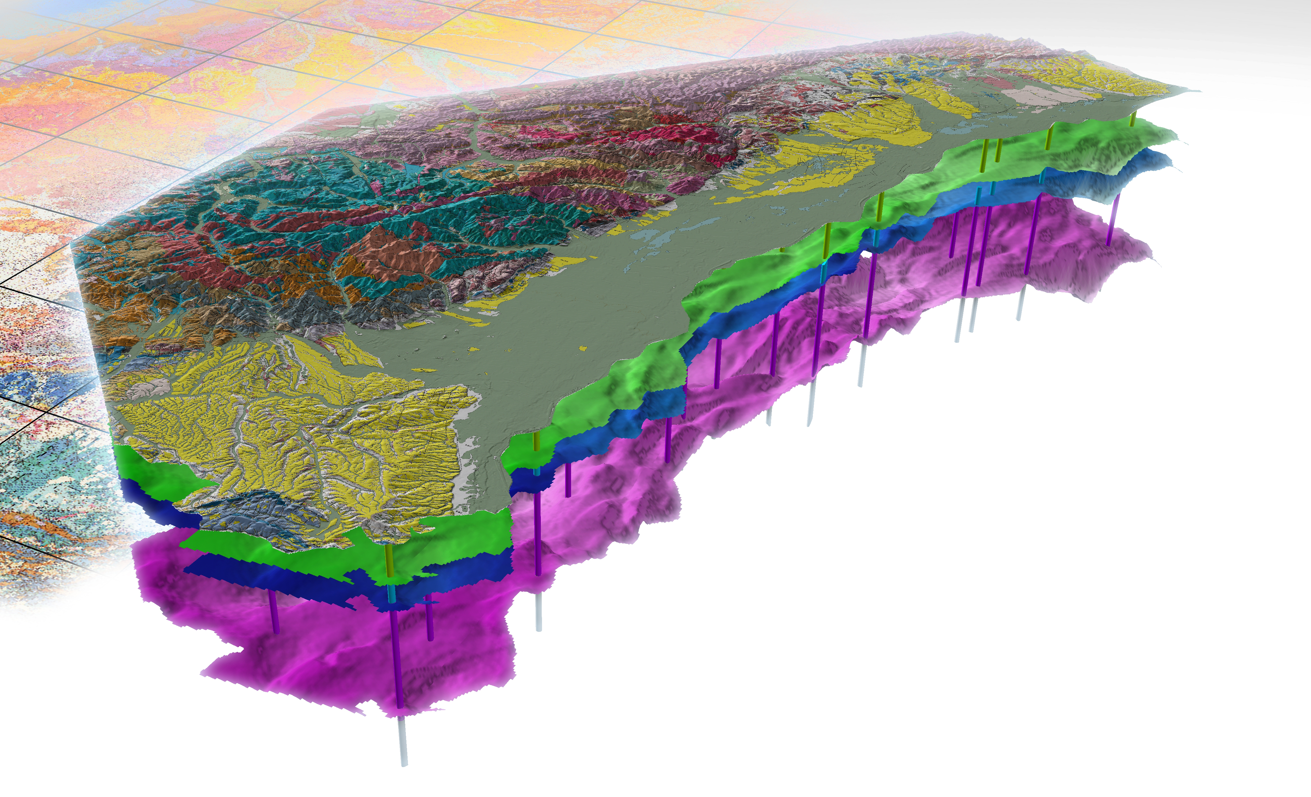 Résultat : une base de données structurée de paramètres géologiques et géophysiques adaptée à la connaissance scientifique avec notamment une modélisation sur une profondeur de 6 km, et une information géologique hiérarchisée également dans le temps. La réalisation et l’intégration de ces informations dans des modèles 3D ont permis de livrer le premier bloc de connaissance tridimensionnelle du territoire.